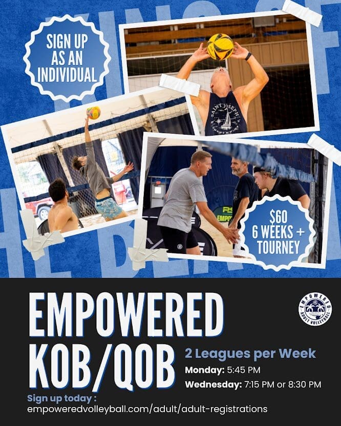 King of Beach (KOB) is a group of individuals ranging from Beginner to Open level who love beach volleyball. It's designed as a ladder league to help players mix socially, improve their skills in beach doubles, and improve their physical fitness.